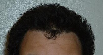 | − | + | A widow's peak is a descending V-shaped point in the middle of the hairline (above the forehead). The trait is inherited genetically and dominant. The term comes from English folklore, where it was believed that this hair formation was a sign of a woman who would outlive her husband. | |