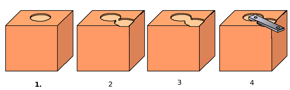 Mill a groove into the top of the leg to accept the bracket. This can be done with a 3/4" spade bit or auger. Drill into the endgrain no more than an eighth of an inch, centered on the leg. Drill a second hole overlapping the first, and make sure the edge of the hole extends over the inside corner of the leg top. If necessary, chisel out a channel between the two holes and then lay the bracket in the channel. The brackets should point towards the center of the table top.