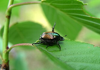 The Japanese beetle (Popillia japonica) is a beetle about 1.5 cm (0.6 inches) long and 1 cm (0.4 inches) wide (smaller in Canada), with shiny copper-colored elytra and a shiny green top of the thorax and head. It is not very destructive in Japan, where it is controlled by natural enemies, but in America it is a serious pest to rose bushes, grapes, crape myrtles, and other plants.
