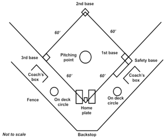 Despite the name, the ball used in softball is not very soft. It is about 11 or 12 in. in circumference for slow-pitch, which is 3 in. larger than a baseball. The infield in softball is smaller than on a baseball diamond; each base is 60 ft. from the next, as opposed to baseball's 90 ft.
