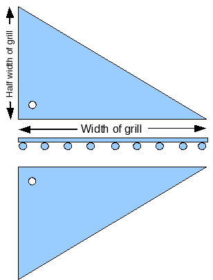 Once the side panels are cut out, use the long dimension of the triangle (the hypotenuse) to set the width of the top and bottom panels. The length of these pieces should be equal to the longest dimension of the grill. Once these pieces are cut out, you need to put a small X crease in them to stiffen them. This can be done by either laying them over a length of upturned angle iron and tapping the crease in with a rubber mallet, or by laying it flat on a floor, and then laying a stiff straight-edge (such as a yardstick) wherever you want the crease. Then work your way under the free end as you hold the straight-edge firmly in place.