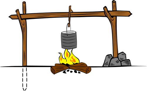 The pictures here are worth many thousands of words. A simple crane propped on a forked stick will hold a cooking container over a fire. It is best to use green wood for any sticks that will be close to the fire, as green wood will resist catching fire better than a dry stick. Be sure to secure any vertical members so that the crane will not fall over when you hang the pot on it. Drive them deeply into the ground, or pin them in place with large rocks. Test the crane before committing your soup to it. If the pot topples, you will extinguish your fire and lose your soup in one sad incident. But at least you'll have a story to tell.