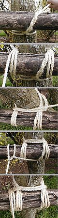 Hilo de empacar tiene suficiente resistencia para algunas aplicaciones de amarre, pero soga se debe utilizar para unir palos más grandes y donde apoya el peso de las personas.