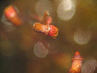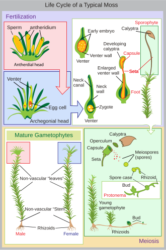 Mosses can be either dioicous or monoicous. In dioicous mosses, both male and female sex organs are borne on different gametophyte plants. In monoicous mosses, they are borne on the same plant. In the presence of water, sperm from the antheridia swim to the archegonia and fertilization occurs, leading to the production of a diploid sporophyte. The sperm of mosses have two flagella that aid in propulsion. Without water, fertilization cannot occur. After fertilization, the immature sporophyte pushes its way out of the archegonial venter. It takes about a quarter to half a year for the sporophyte to mature. The sporophyte body comprises a long stalk, called a seta, and a capsule capped by a cap called the operculum. The capsule and operculum are in turn sheathed by a haploid calyptra which is the remains of the archegonial venter. The calyptra usually falls off when the capsule is mature. Within the capsule, spore-producing cells undergo meiosis to form haploid spores, upon which the cycle can start again. The mouth of the capsule is usually ringed by a set of teeth called peristome. This may be absent in some mosses.