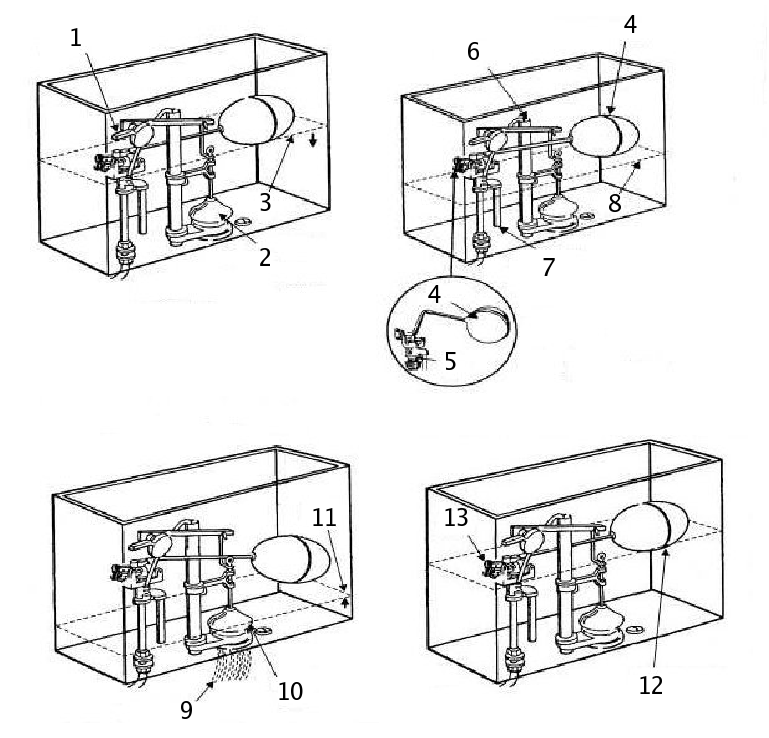 Before a person can repair anything, he or she must understand how that item is supposed to work. The illustration below shows the steps in a toilet flush mechanism: