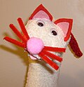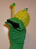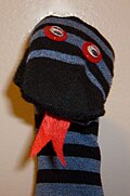 A sock puppet is a puppet made from a sock (or similar garment). When the manipulator fits a hand into the closed end of the sock, the puppet can be seemingly made to "talk". The puppet's mouth is formed by pushing the sock's toe into the puppeteer's palm, with the puppeteer's thumb forming the jaw. The top of the puppet's head is formed by the sock's heel. If desired, felt can be sewn into the sock to stiffen it and form the inside of the mouth. The sock is stretched out fully so that it is long enough to cover the puppeteer's wrist and part of the arm.