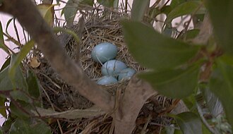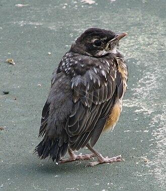 | The American Robin has gray upperparts and head, and orange underparts, usually brighter in the male. Robins are frequently seen running across lawns, picking up earthworms by sight. In fact, the running and stopping behavior is a distinguishing characteristic. When stopping, they are believed to be listening for the movement of prey. | |