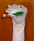 A sock puppet is a puppet made from a sock (or similar garment). When the manipulator fits a hand into the closed end of the sock, the puppet can be seemingly made to "talk". The puppet's mouth is formed by pushing the sock's toe into the puppeteer's palm, with the puppeteer's thumb forming the jaw. The top of the puppet's head is formed by the sock's heel. If desired, felt can be sewn into the sock to stiffen it and form the inside of the mouth. The sock is stretched out fully so that it is long enough to cover the puppeteer's wrist and part of the arm.